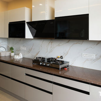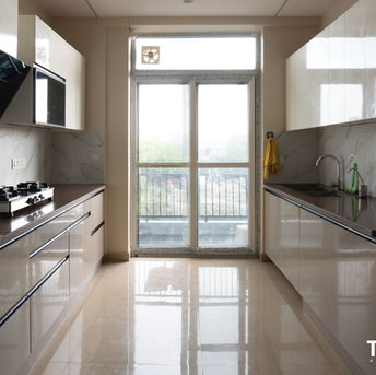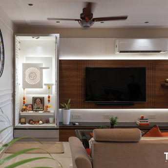 Located in Sector 4, Panchkula, this thoughtfully designed interior embraces soft pastel tones, creating a calming and minimalist atmosphere. The main living hall boasts a multifunctional entertainment unit that seamlessly integrates a TV, puja, and crockery display, serving both aesthetic and functional purposes. Positioned in front is a comfortable L-shaped sofa for lounging, while a 4-seater dining table is placed conveniently near the crockery unit and adjacent to the kitchen.