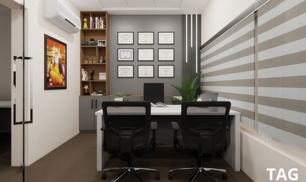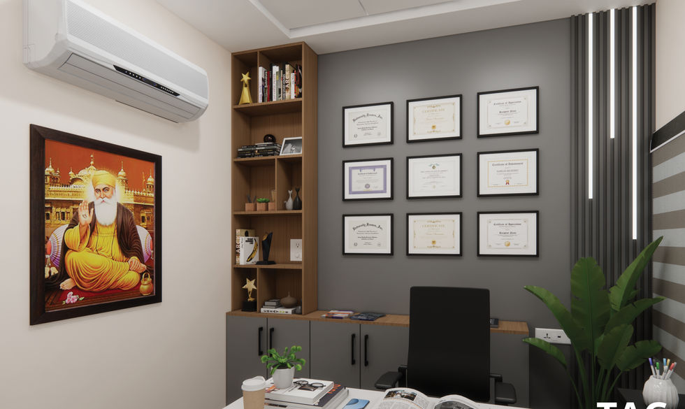 The Office Interior has a calming color scheme of greys and wooden textures, making the room feel peaceful and professional. Louvers on the corner with profile lights add an interesting element with a lively plant in front bringing a touch of nature indoors.